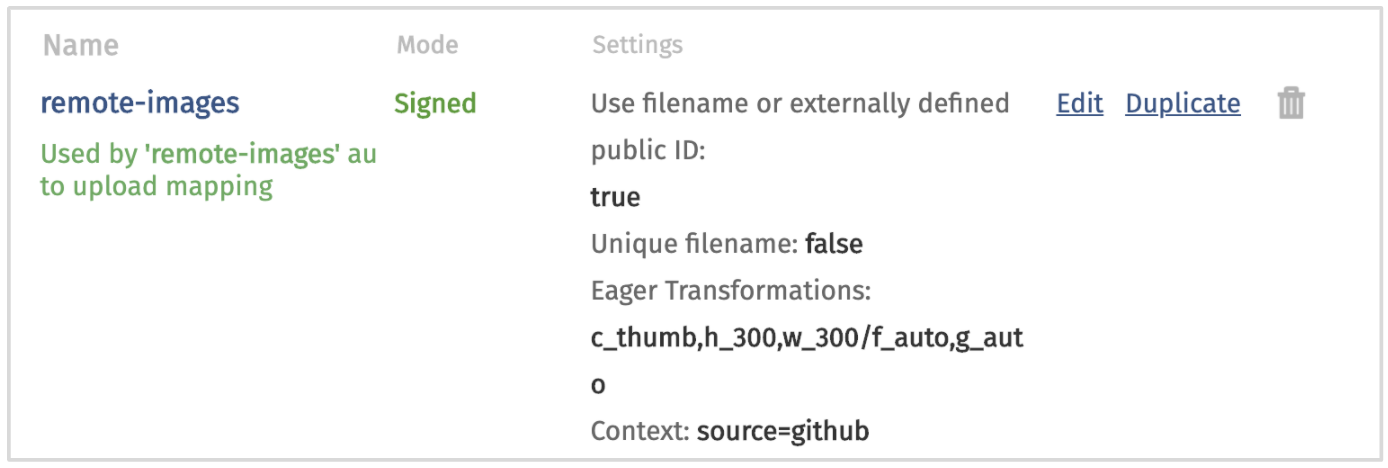 cloudinary.api.create_upload_preset({name: 'remote-images',use_filename: true,unique_filename: false,unsigned: false,context: 'source=github',eager: {transformation: [{crop: 'thumb',height: '300',width: '300'},{gravity: 'auto',fetch_format: 'auto'}]}})